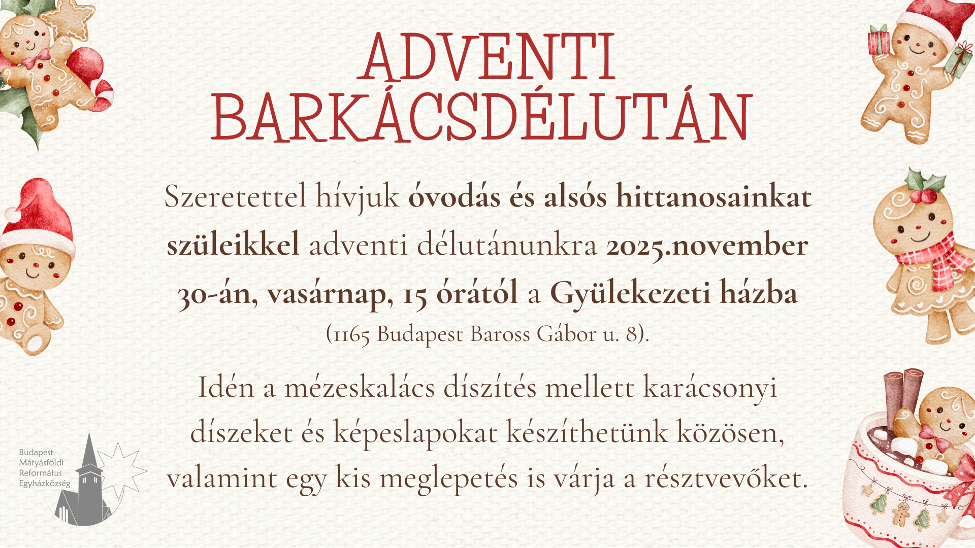 Hírek Szerettettel várjuk az óvodás és alsós hittanosainkat szüleikkel együtt adventi délutánra 2025. november 30-án 15 órától a Gyülekezeti házba.